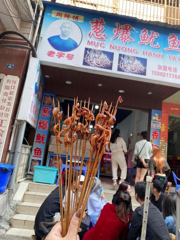 Mực nướng ông trọc- món ăn hấp dẫn nổi tiếng ở Hà Khẩu.