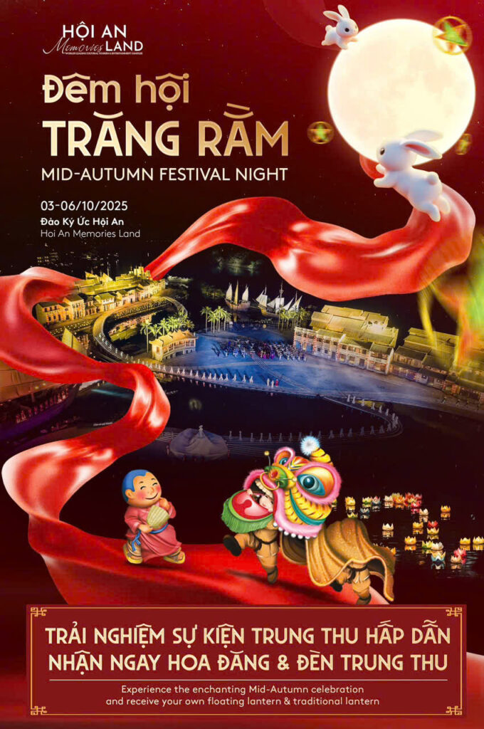 Từ 03 – 06/10/2025, trung thu ở thành phố di sản sẽ rực rỡ hơn bao giờ hết khi Đêm Hội Trăng Rằm trở lại tại Đảo Ký Ức Hội An. Hãy hòa mình vào loạt trải nghiệm cực hấp dẫn, cùng đón chào một mùa trung thu đầy “ký ức”:
